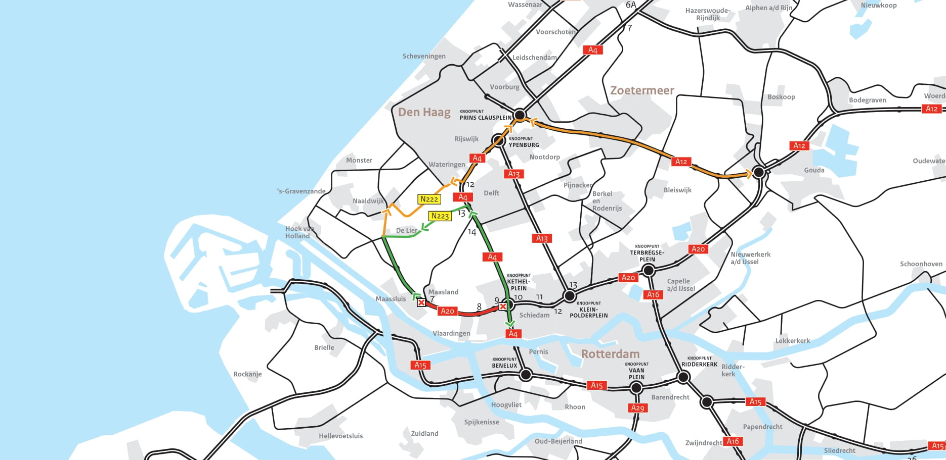 · Doorgaand verkeer tussen knooppunt Kethelplein en Maassluis wordt omgeleid via de A4, de N223, knooppunt Westerlee en de A20 (v.v.).