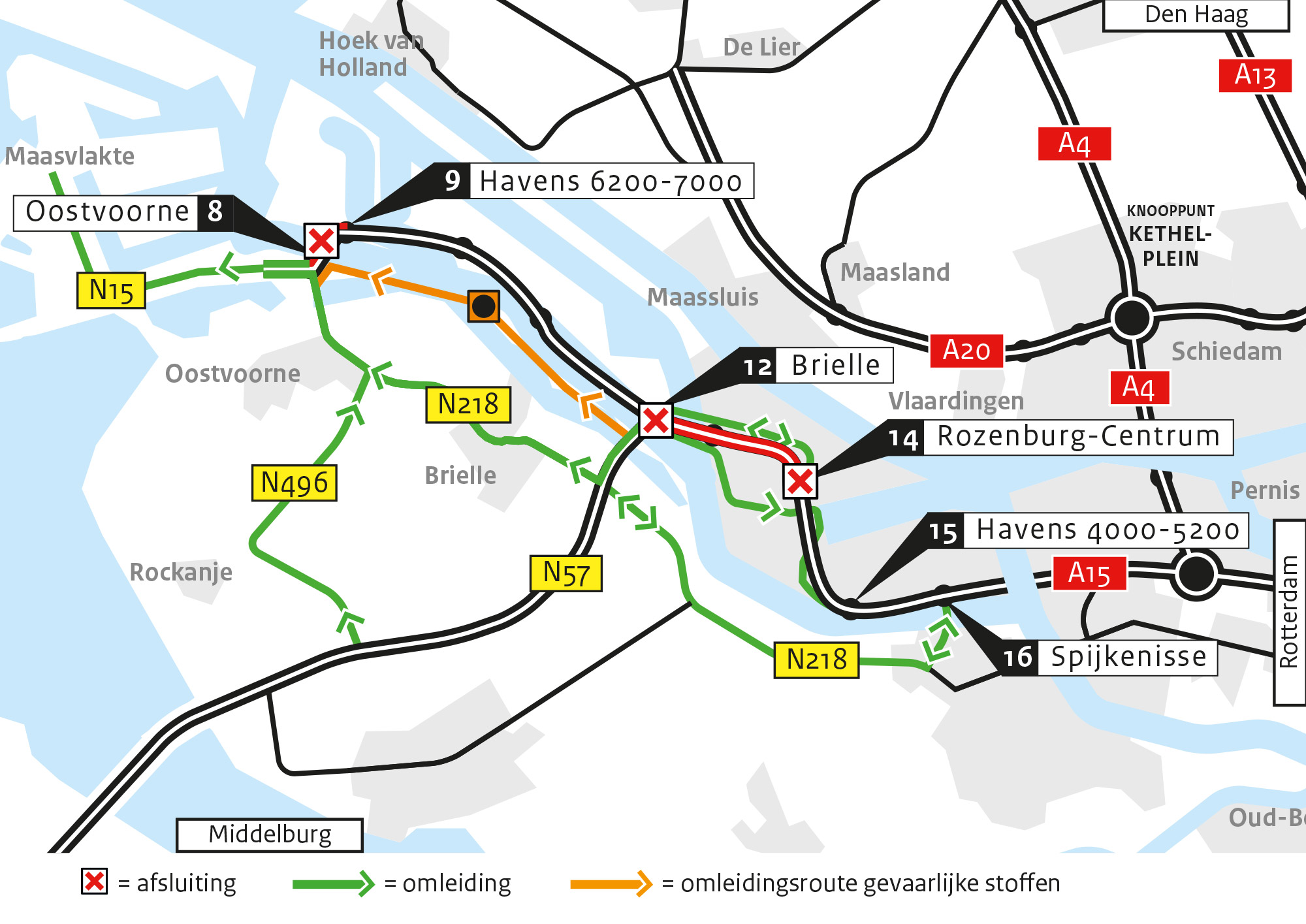 • Met bestemming in en om Rozenburg: omleiding via afrit 12 (Brielle), Calandbrug, Droespolderweg en Botlekweg.