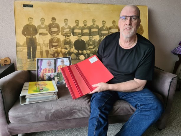 Boven: Rien Stolk nog eenmaal op de bank met zijn Fortuna-archief.