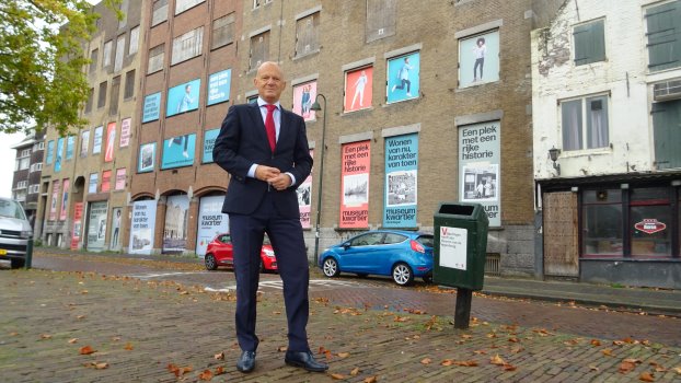 Wijst uit zijn stadsburgermeesterlijke raam richting het Waaigat en zegt: ‘Dat is een farce. Er is van alles misgegaan. Hoe lang staat het al leeg? Drie jaar of langer? Dat had allang bewoond moeten zijn. De woningnood is hoog en ook dienen fractionele oplossingen snel gerealiseerd. Gelukkig is er nu zicht op dat dit ook daadwerkelijk gebeurt.’