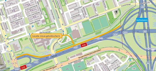 Aan de noordkant van de A20 tussen het Kethelplein en de Holysingel bouwt Rijkswaterstaat een betonnen geluidscherm van vier meter hoog. Het scherm is qua uiterlijk vergelijkbaar met het geluidscherm dat al aan de zuidkant van de A20 staat. De werkzaamheden starten medio mei bij het Kethelplein en schuiven op richting de Holysingel.