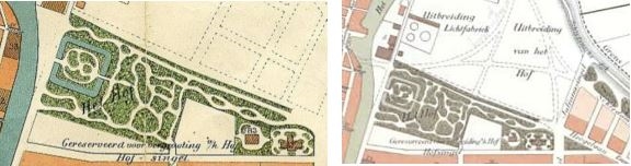 Twee kaarten uit de jaren '10 en '20 van de vorige eeuw, met daarop de reservering voor uitbreiding van het Hof. Op de kaart links was ten noorden van het Hof een nieuwe buurt voorzien, op de kaart rechts zijn de eerste contouren van het Oranjepark zichtbaar.