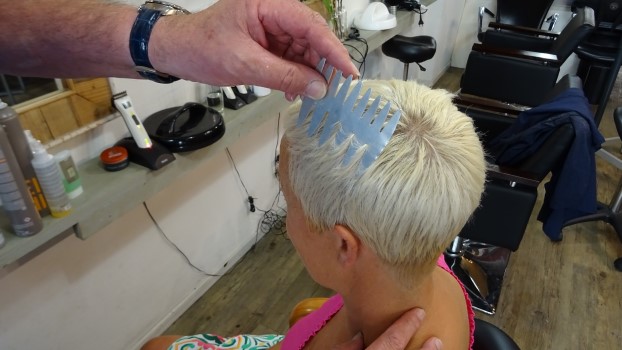 ‘Vroeger had ik krullen. Geen horlogeveertjes. Meer een grove slag. Sinds ik bij Karel ben is die frivoliteit in onderling overleg verdwenen. Nu ben ik echt elke keer gelukkig met mijn korte koppie. Kom ik weer buiten krijg ik vaak positief commentaar. Denken mensen dat het zo, met die kabbelende golfjes, is geknipt. Maar het is die wonderkam van aluminium. Laatste restante van de node gemiste Vlaardingse LTS.’