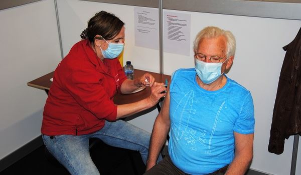 SCHIEDAM - De GGD Rotterdam Rijnmond heeft zojuist de eerste prik gezet in de om negen uur vanochtend geopende vaccinatielocatie in de Sporthal Groenoord in Schiedam. Dit is de zevende priklocatie die nu geopend is, van de in totaal negentien te openen priklocaties in de regio. Schiedammer Henk Steenbergen (74) had de eer om als eerste te worden gevaccineerd.