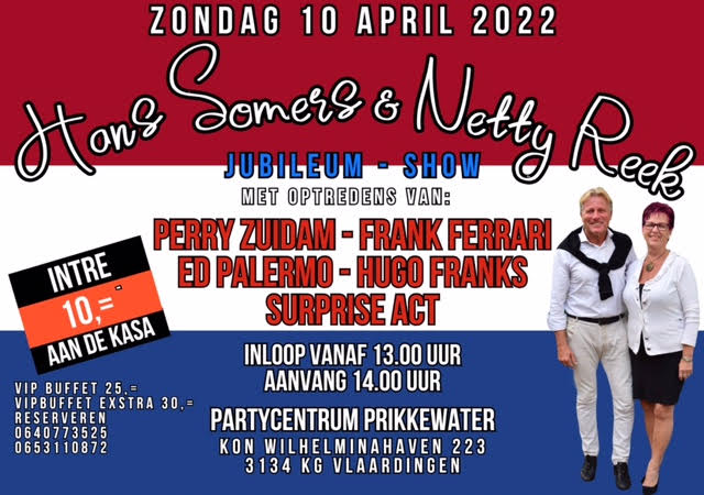 Zondag 10 April 2022, slaan Martin Poot, ‘t Prikkewater, Vlaardingen en artiest Hans Somers, samen met Netty Reek de handen ineen om hun dubbele JUBILEUMSHOW te vieren.