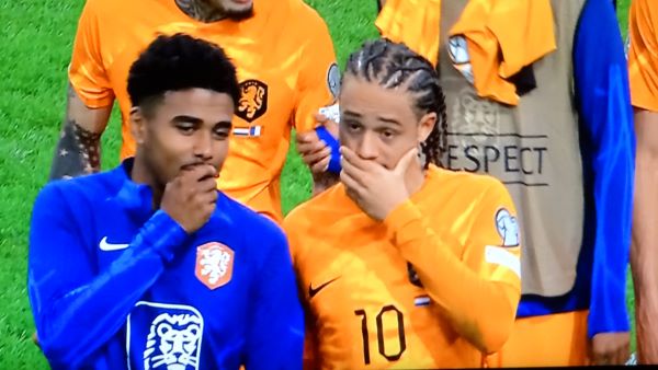 Ian Maatsen monkelt na afloop van de met 1-2 verloren wedstrijd op 13 oktober vorig jaar tegen Frankrijk met de één jaar jongere Xavi Simons. Met enig geluk hebben ze daar straks ruim een maand de tijd voor ...