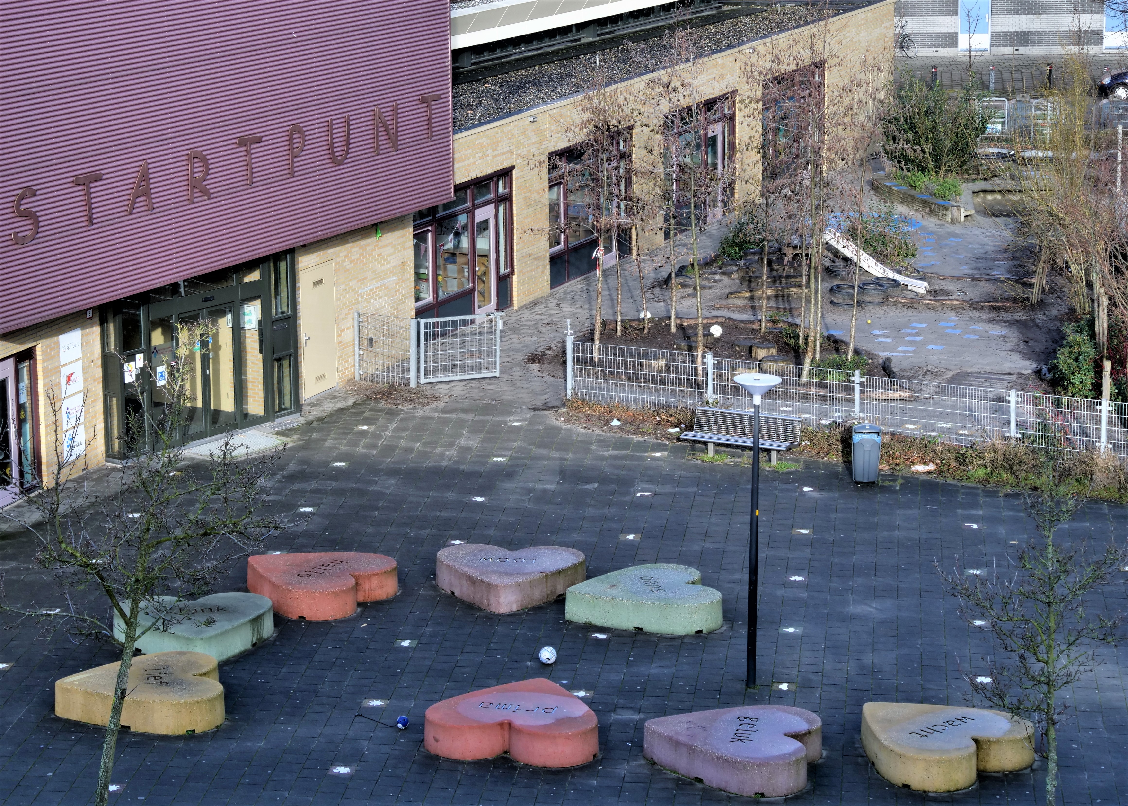 De jeugd is goed te spreken over de mooie en vrolijke kleuren: ‘Ik speel en spring al sinds mijn vierde op die hartjes.Ze maken me blij.’ En ze passen goed bij de school.