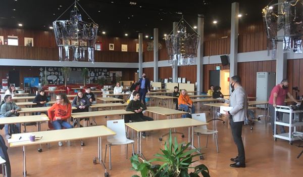 “Fijn dat jullie weer terug zijn op school en dat jullie je hebben opgegeven voor het project TaalChamp. Ook heel fijn is dat dit nu hier live kan en dat het niet via Teams hoeft. Met Teams hebben we het allemaal wel een beetje gehad hè”, zo sprak Caroline van den Bergh, afdelingsleider brugklassen, de 23 brugklassers toe in de ruime aula. De tafels waren zodanig neergezet dat er meer dan anderhalve meter afstand gehouden kon worden en de mondkapjes af mochten zodra de kinderen op hun plaats zaten. “Maar als je je veiliger voelt met mondkapje, hou het dan op. Dat bepaal je zelf.” Caroline van den Bergh vervolgde: “We hebben geld gekregen van de gemeente om de taalvaardigheid een boost te kunnen geven. Je krijgt gedurende drie maanden twee uur extra les per week. We gaan het op een leuke manier doen. Je krijgt tijdens het project een e-reader te leen, met een abonnement om boeken te lezen, een abonnement op de krant (AD) en jullie gaan ook zelf schrijven.”