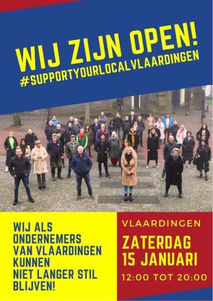 Zaterdag 15 januari is een aantal winkels en horecagelegenheden in het nog slechts zwak kloppend stadshart van 12.00 tot 20.00 uur geopend. De ondernemers zijn de gekte niet alleen meer dan zat, ook vinden zij dat ten opzichte van andere Europese landen een laf standpunt wordt ingenomen. ‘Over betutteling,’ volgens enkele ondernemers.