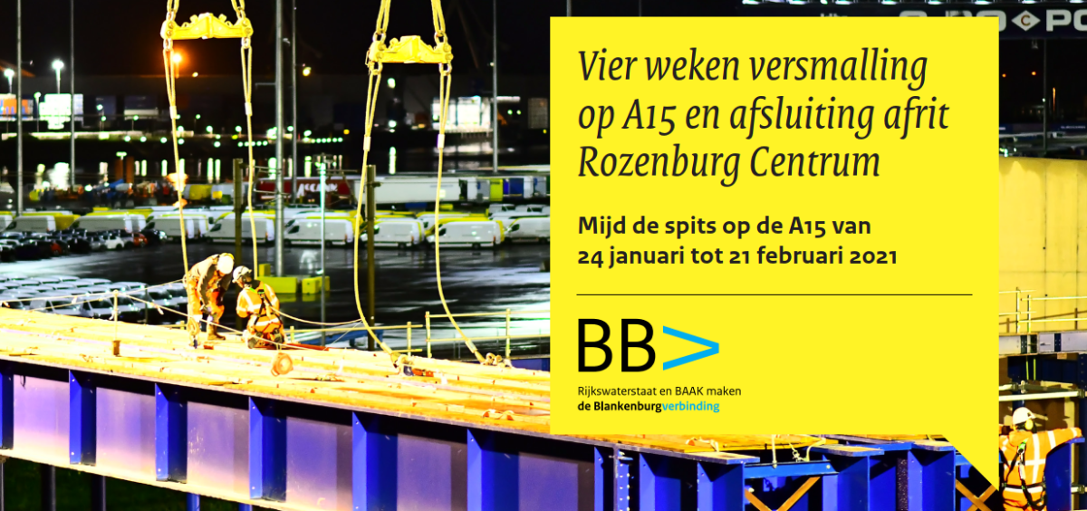 Van zondag 24 januari tot zaterdagavond 20 februari wordt de A15 ter hoogte van Rozenburg versmald van 3 naar 2 rijstroken per richting. Ook afrit 14 Rozenburg Centrum van de A15 vanuit Europoort is in deze periode afgesloten. In de ochtend- en avondspits kunnen files ontstaan. Weggebruikers wordt aangeraden om de spits zoveel mogelijk te mijden. De versmalling is nodig vanwege werkzaamheden aan de Blankenburgverbinding, de nieuwe snelweg tussen de A15 en de A20.