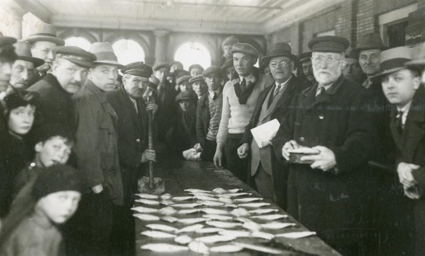 Venster Buisjesdag: Fotobijschrift; ‘Visafslag onder de overkapping van de Visbank, circa 1931’. Fotograaf onbekend, collectie Stadsarchief Vlaardingen.