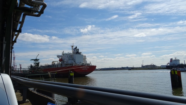 Wie op het Vopak-terrein doorloopt naar de waterkant ziet daar twee steigers. Daar waar zeeschepen, veelal uit Azië, hun lading (oliën) lossen om te worden opgeslagen in een van de vele tanks. Van daaruit gaat het na korte of langere tijd per binnenvaartschip of tankwagen richting achterland of gewoon naar Rotterdam.