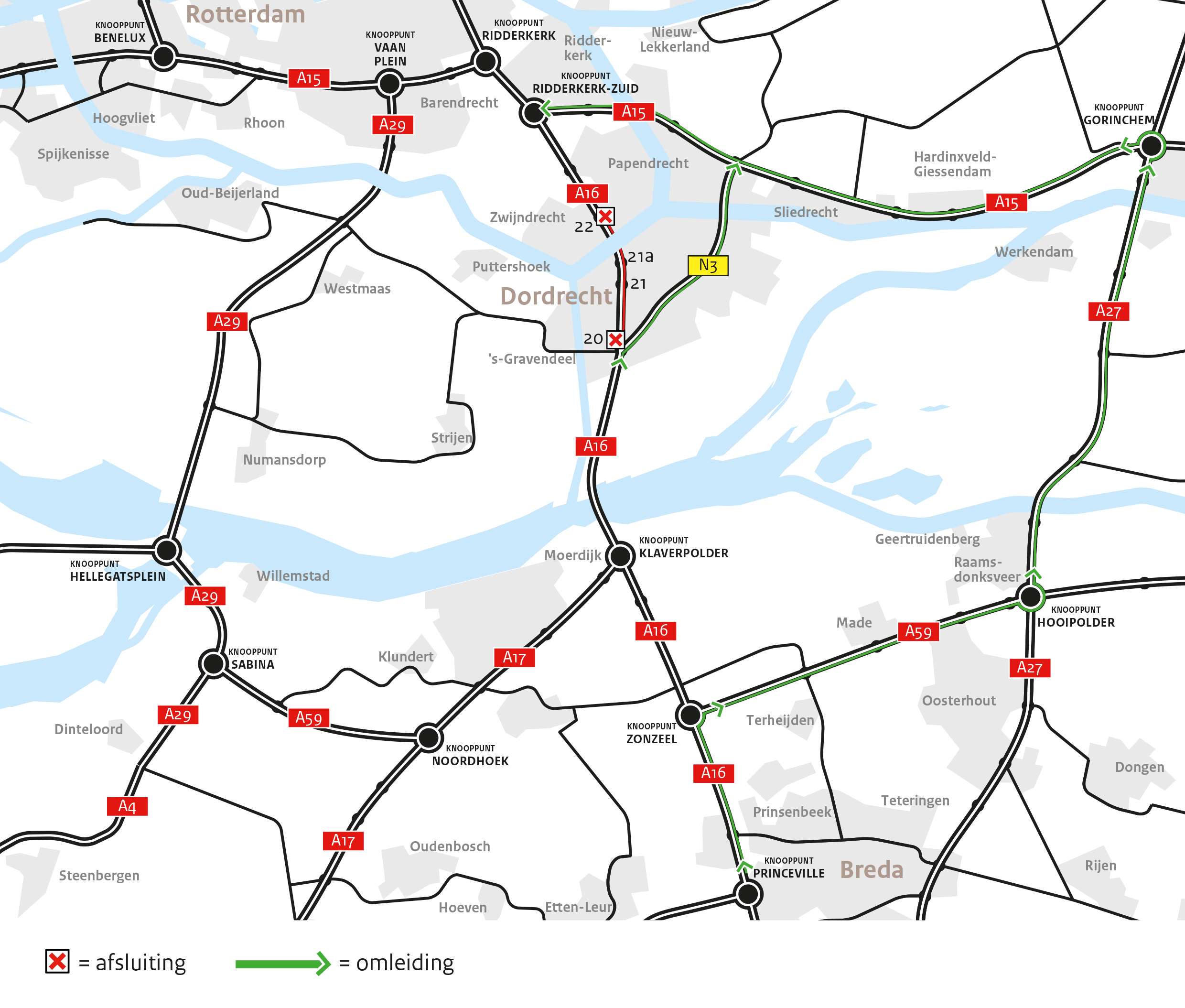 Verkeer richting Rotterdam wordt omgeleid via de A16 richting Breda, de N3 en de A15.