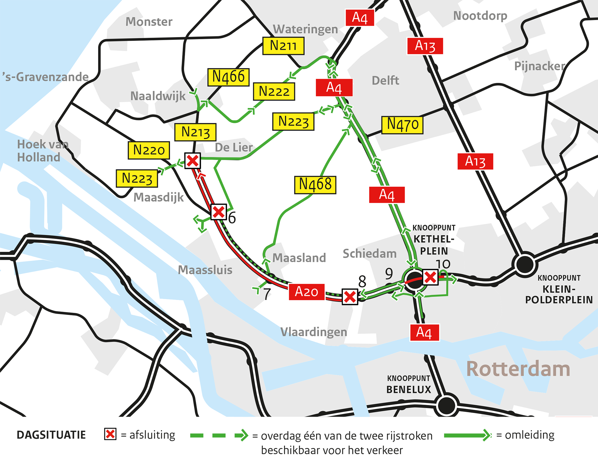 • De A20 richting Hoek van Holland is alleen toegankelijk tot Maasdijk, vanaf de A4 (er is dan één rijstrook beschikbaar).