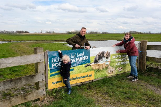De campagne 'Kuikens in het land, poes in de mand' is inmiddels gestart in Midden-Delfland. Ansichtkaarten worden verspreid en in de weidevogelpolders hangen banners met de oproep. Op de website www.poesindemand.nl is een campagnefilm te zien met poes Gurbe in de hoofdrol. Laten we samen zorgen voor een veilige leefomgeving voor deze kwetsbare kuikens en zegt het voort: 'Kuikens in het land, poes in de mand'.
