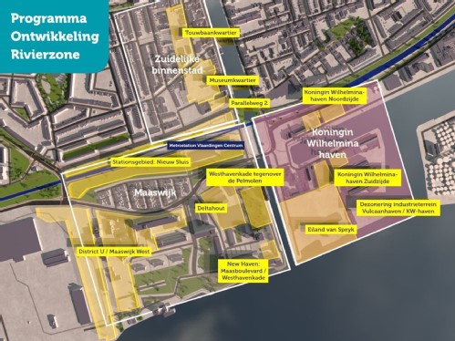 Met de verschillende woningbouwprojecten voorziet de ontwikkeling van de Rivierzone in de enorme woonbehoefte. In totaal komen er tussen de 2450 en 3100 nieuwe woningen bij in een mix van hoogstedelijke bouw en groen. Het Programma Ontwikkeling Rivierzone bestaat uit drie gebieden: de Koningin Wilhelmina haven, Maaswijk en de zuidelijke binnenstad. In deze gebieden worden nieuwe woningen gebouwd en komen voorzieningen. Naast woningen wordt ook de openbare ruimte van de Rivierzone de komende jaren opnieuw ingericht. Zo zal onder andere het Maaspark veranderen, krijgen de havens bescherming tegen hoogwater en komen er nieuwe en betere verbindingen voor auto’s, fietsers en voetgangers in het gebied.