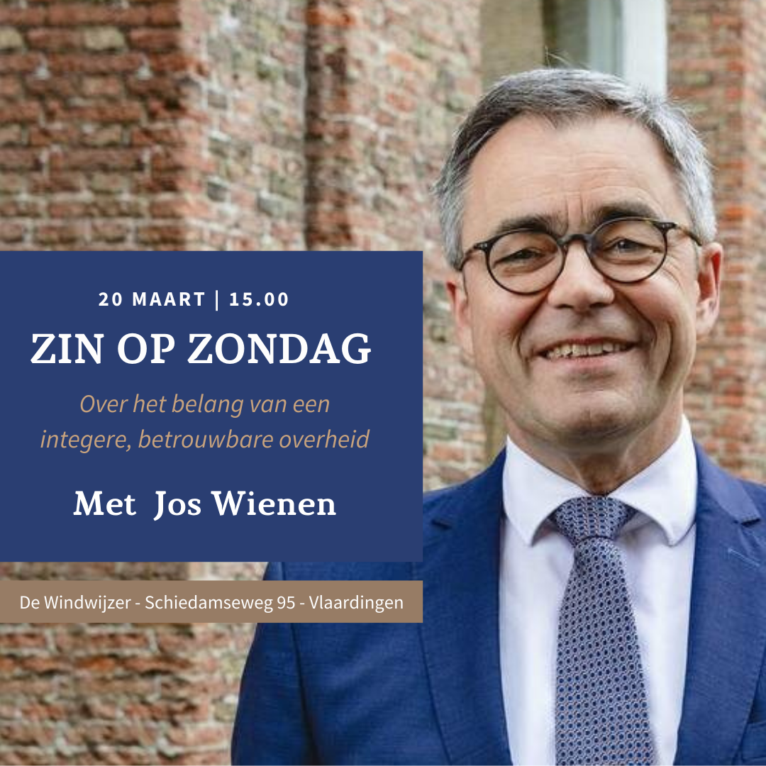 Op zondag 20 maart is er van 15.00 – 16.00 uur weer Zin op Zondag in De Windwijzer, Schiedamseweg 95. Dit keer is drs. Jos Wienen bij ons te gast. Hij is sinds 2016 burgemeester van Haarlem. In 2018 werd bekend dat hij al enige tijd onder strenge bewaking functioneerde wegens ernstige bedreigingen aan zijn adres.